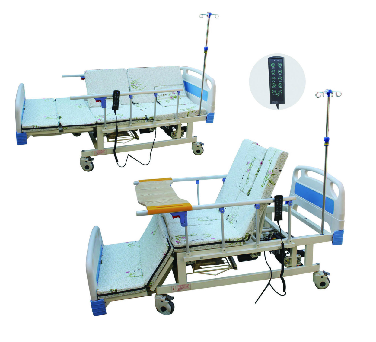 配置參數(shù): ABS床頭+4柱半護欄+木餐桌+靜音腳輪+輸液 架+6cm床墊+便盆+洗頭盆+便口
